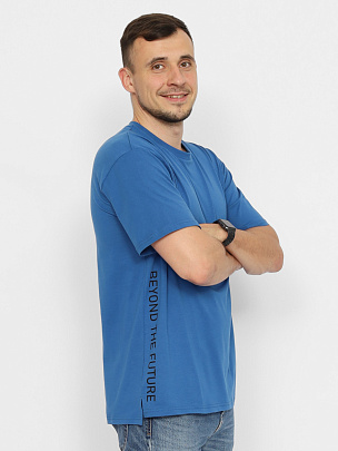 Футболка с коротким рукавом. Горловина круглая, обработана узким воротником из полотна с эластаном. Перед оформлен шрифтовым принтом.